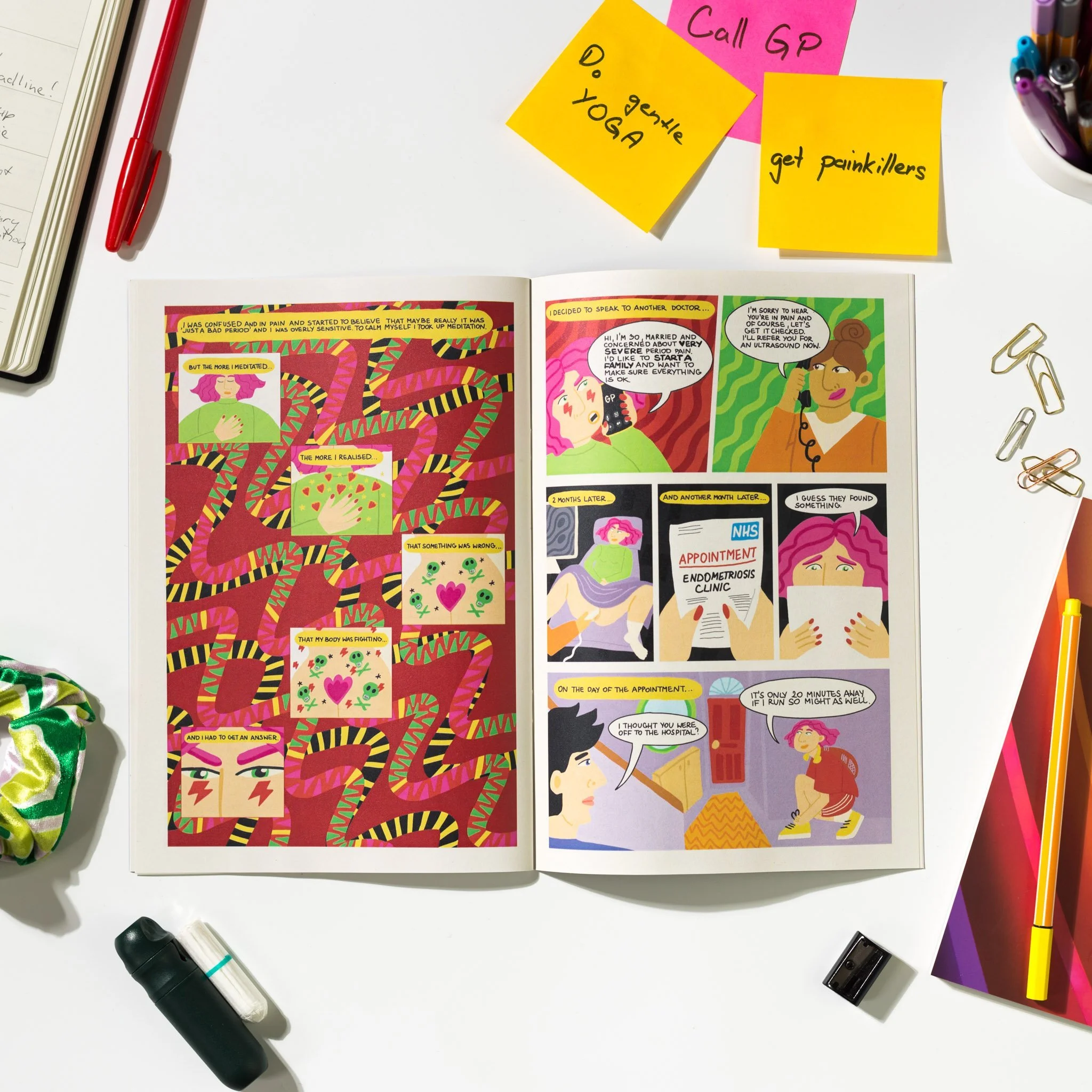 RAW is a comic zine that tells a story of a woman struggling with endometriosis. Follow her journey through severe pain, feeling misunderstood, failed visits to the GP, to first learning about endometriosis and fighting for her diagnosis.